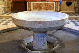 Incuestionablemente, la PILA BAUTISMAL representa, precisamente, a la PIEDRA VIVA, al SEXO. Allí está el "Agua Lustral" : el Mercurio de los Sabios, y en cuanto al Fuego, representa al Azufre de los Alquimistas medievales. Se le pone Sal al niño (en la lengua o en la boca) y se completa el trío de Sal, Azufre y Mercurio. SAL, la que se pone al niño; AZUFRE, el Fuego; MERCURIO, el agua, y es bautizada la criatura. Esa agua no es otra cosa sino el "Alma Metálica del Esperma". Eso simboliza realmente, eso alegoriza...