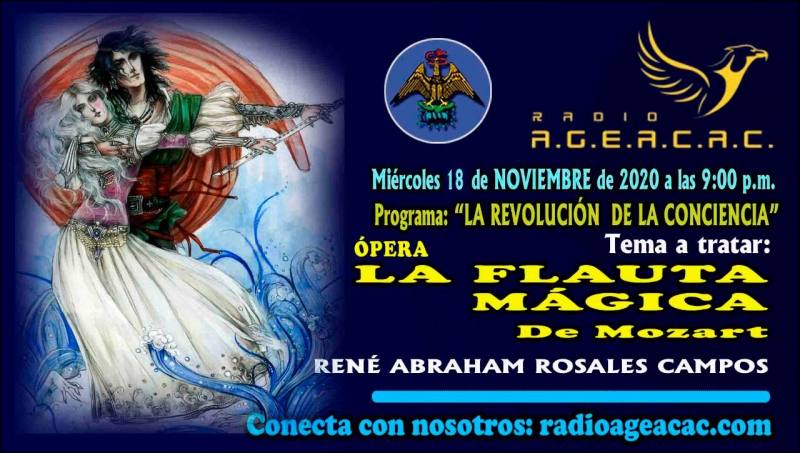 El programa la revolución de la conciencia te presenta el programa La flauta encantada de Johannes Chrysostomus Wolfgangus Theophilus Mozart, aquí un poco de el (Salzburgo, 27 de enero de 1756-Viena, 5 de diciembre de 1791), más conocido como Wolfgang Amadeus Mozart, fue un compositor, pianista, director de orquesta y profesor del antiguo Arzobispado de Salzburgo (anteriormente parte del Sacro Imperio Romano Germánico, actualmente parte de Austria), maestro del Clasicismo, considerado como uno de los músicos más influyentes y destacados de la historia.